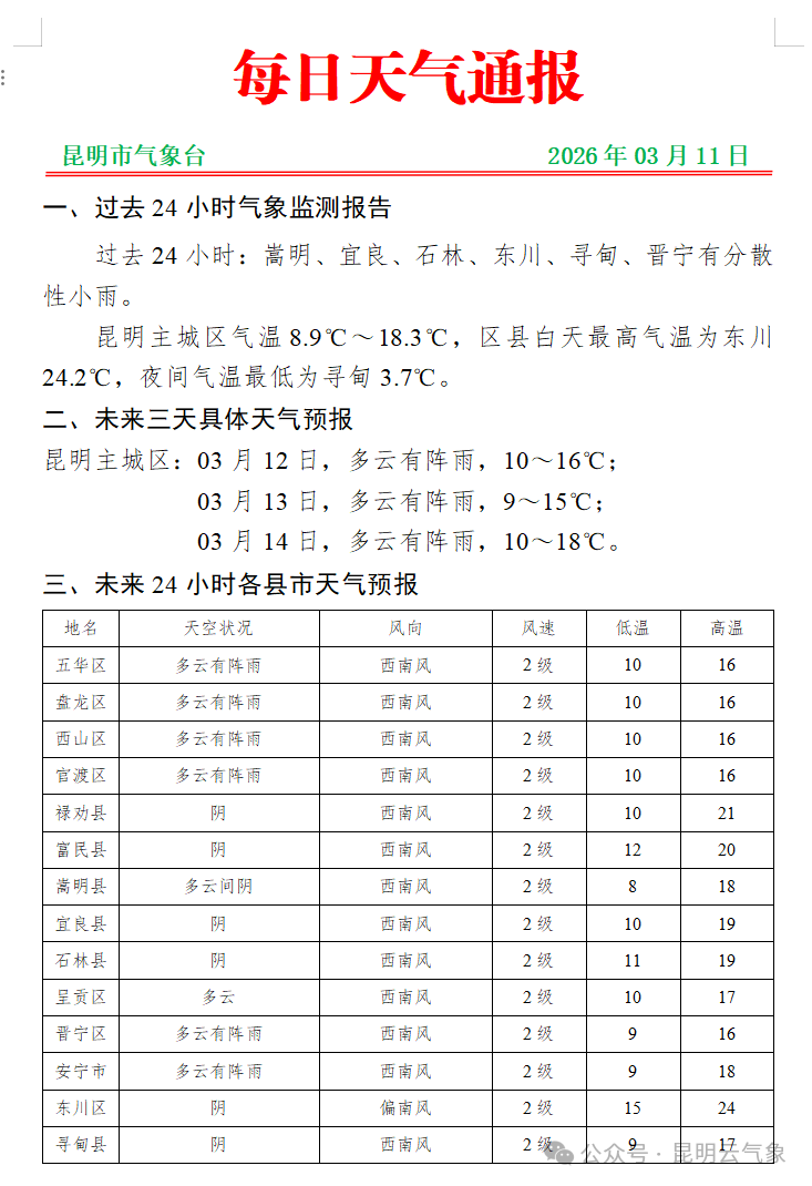 未来三天昆明主城区天气预报