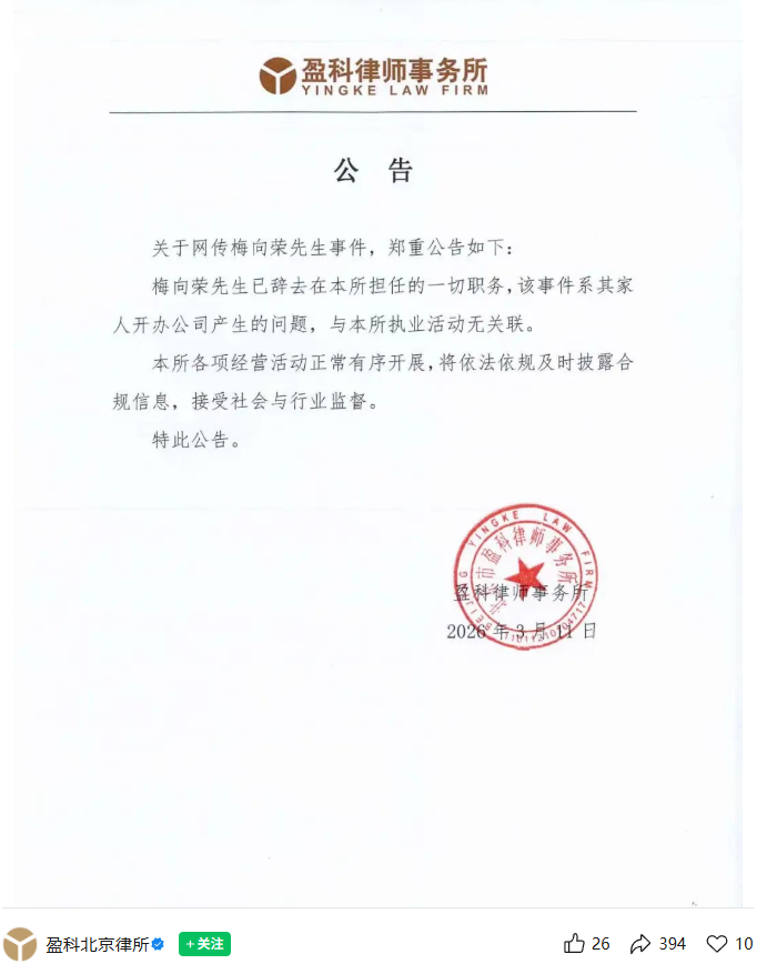 3月11日深夜,盈科律师事务所就网传梅向荣先生事件,郑重公告如下:“梅向荣先生已辞去在本所担任的一切职务,该事件系其家人开办公司产生的问题,与本所执业活动无关联。本所各项经营活动正常有序开展,将依法依规及时披露合规信息,接受社会与行业监督。”