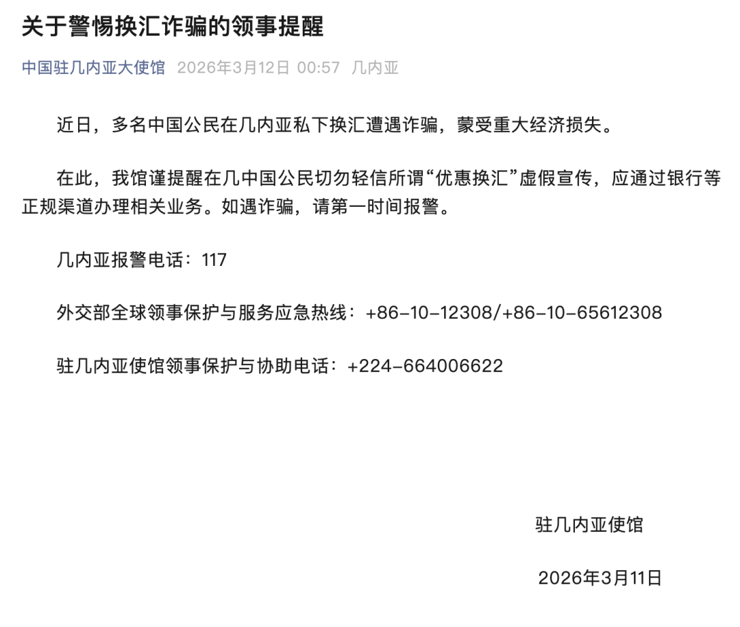 3月12日凌晨,中国驻几内亚大使馆发布《关于警惕换汇诈骗的领事提醒》: