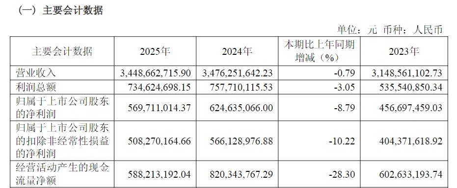 天味食品日前发布的2025年年报显示,公司全年实现营业收入34.48亿元,同比下降0.79%;实现归属于上市公司股东的净利润5.69亿元,同比下降8.79%;实现扣非归母净利润5.08亿元,同比下滑10.22%;基本每股收益0.5386元,同比下滑9.11%。分红方面,天味食品拟向全体股东每股派发现金红利0.55元(含税)。