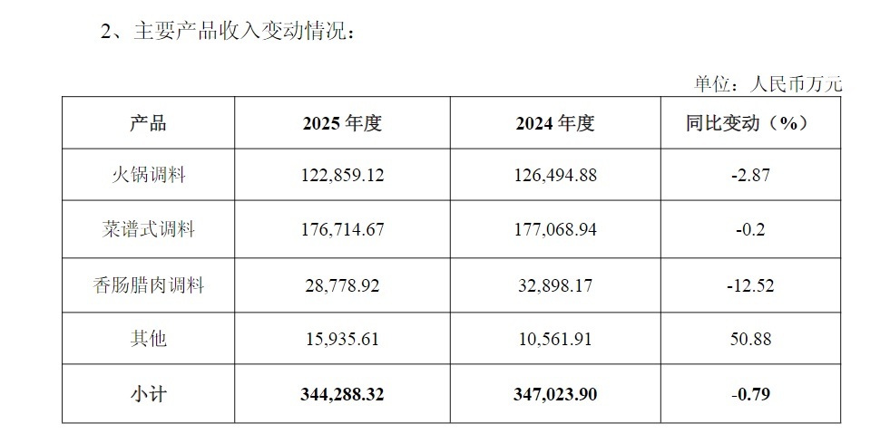 渠道方面,从天味食品披露的情况来看,线下渠道一直是公司的收入主心骨,然而在2025年,该渠道的销售收入同比下滑了12.76%,其传统经销渠道的销售阻力有所增大。