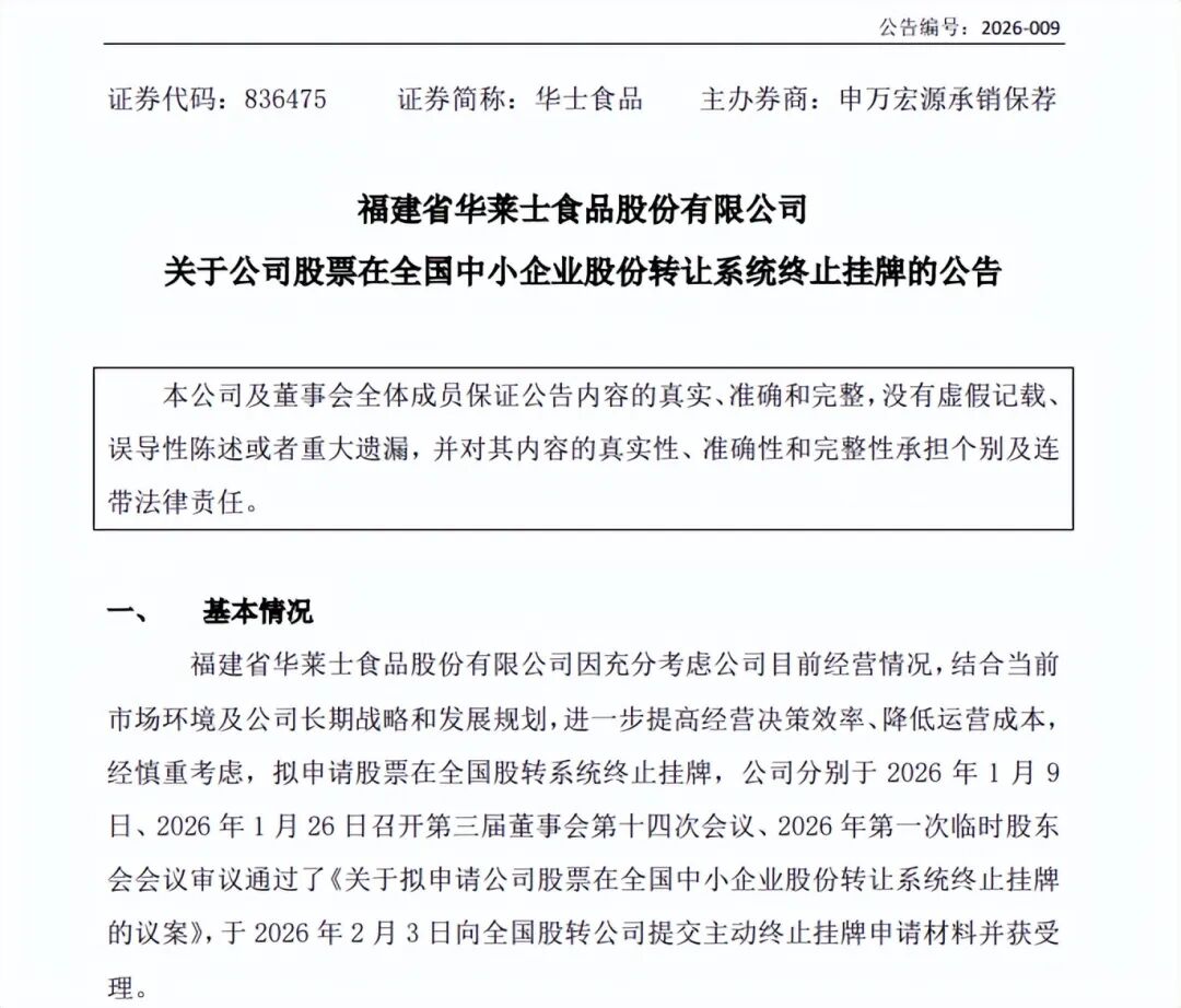2026年2月11日,福建省华士食品股份有限公司(简称“华士食品”)发布《关于公司股票在全国中小企业股份转让系统终止挂牌的公告》,宣告公司正式完成新三板摘牌,股票自2026年2月12日起终止在全国中小企业股份转让系统挂牌,结束其近十年的上市历程。