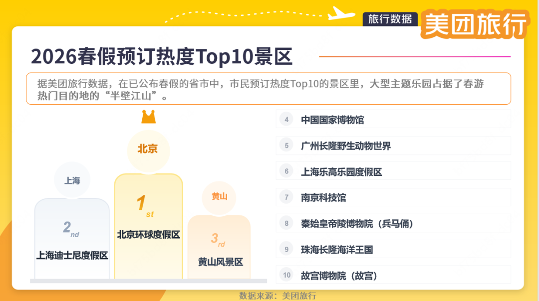 美团旅行数据显示,在已公布春假的省市中,春假期间预订热度最高的TOP10景区,既有北京环球度假区、上海迪士尼度假区、广州长隆野生动物世界等“老牌顶流”,也有黄山风景区、故宫博物院(故宫)、秦始皇帝陵博物馆(兵马俑)等文化地标。而南京科技馆作为唯一的“科技+自然”复合型景区,位列第七,成为不少家庭过春假的首选。