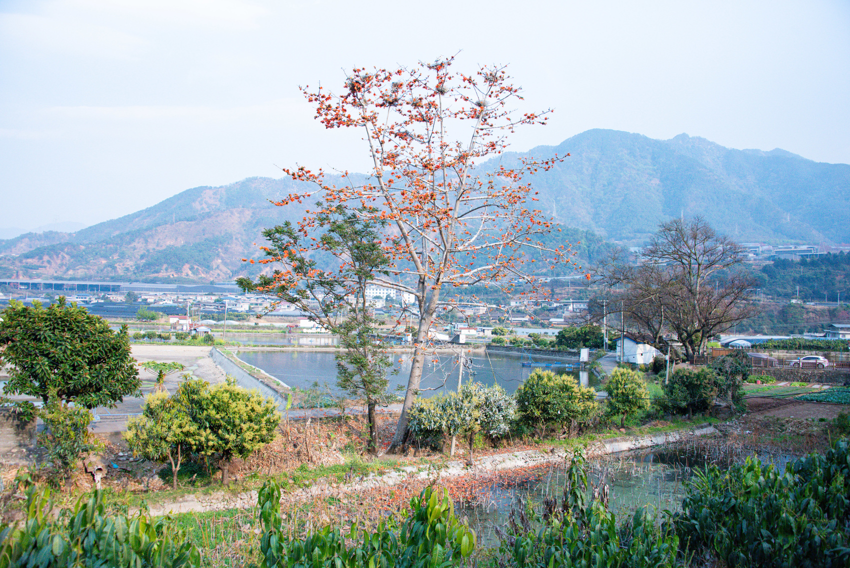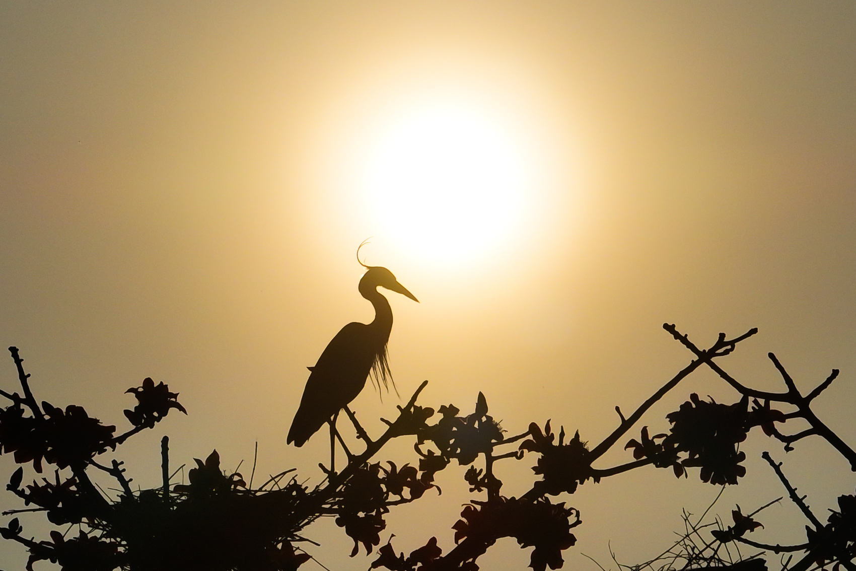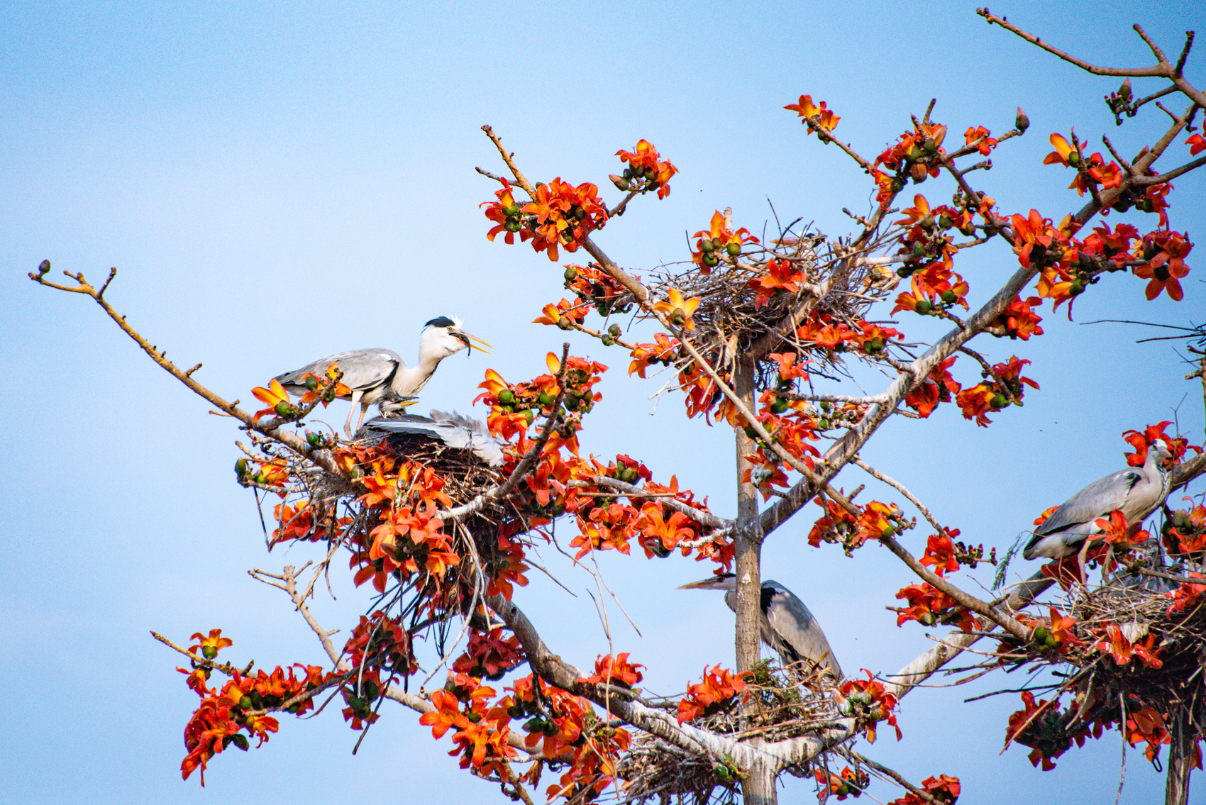 灰鹭正栖息在攀枝花树上。周万秋摄