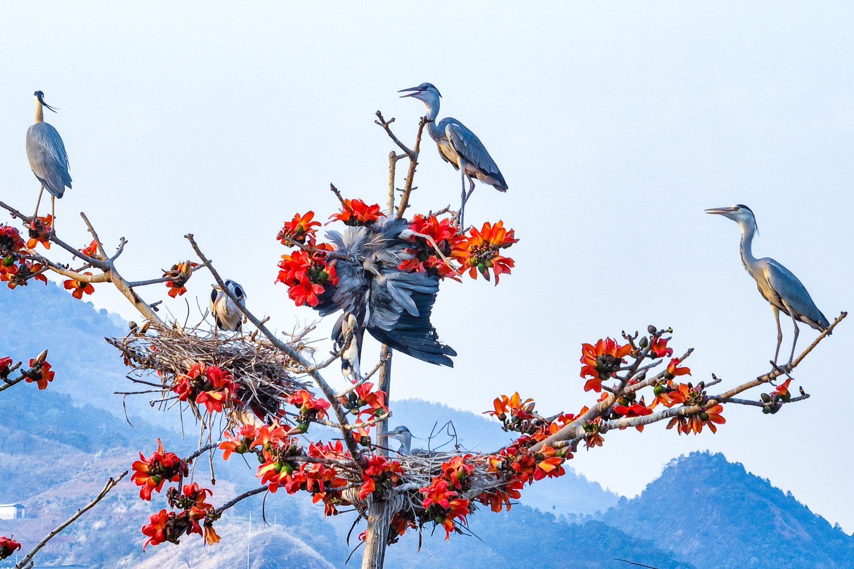 近日,国网米易县供电公司输电运检班员工周万秋在用无人机开展电力线路防山火巡视工作时,于攀枝花市米易县境内意外拍摄到一群国家二级保护动物——灰鹭,栖息在一棵攀枝花树上。