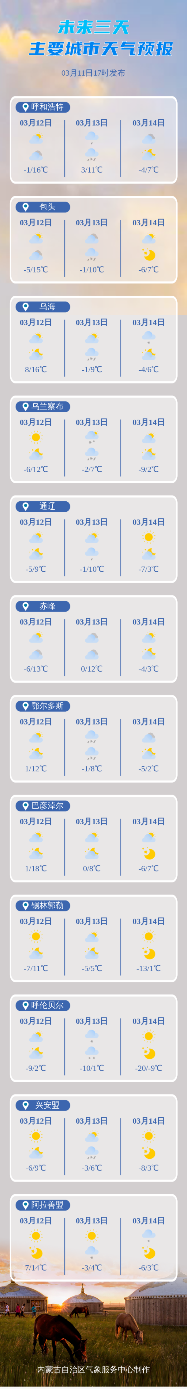 未来三天(3月12日—14日),这股“全能型”冷空气将自西向东席卷内蒙古,我区大部地区将经历一场集大风、沙尘、强降雪与剧烈降温于一体的极端天气轮番轰炸,中西部和东部均将笼罩在飞沙走石与风雪交加之中。