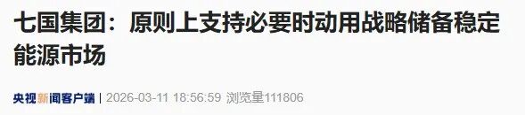 据央视新闻,七国集团能源部长发表联合声明称,各方原则上支持采取积极措施应对当前局势,包括在必要时动用战略能源储备。