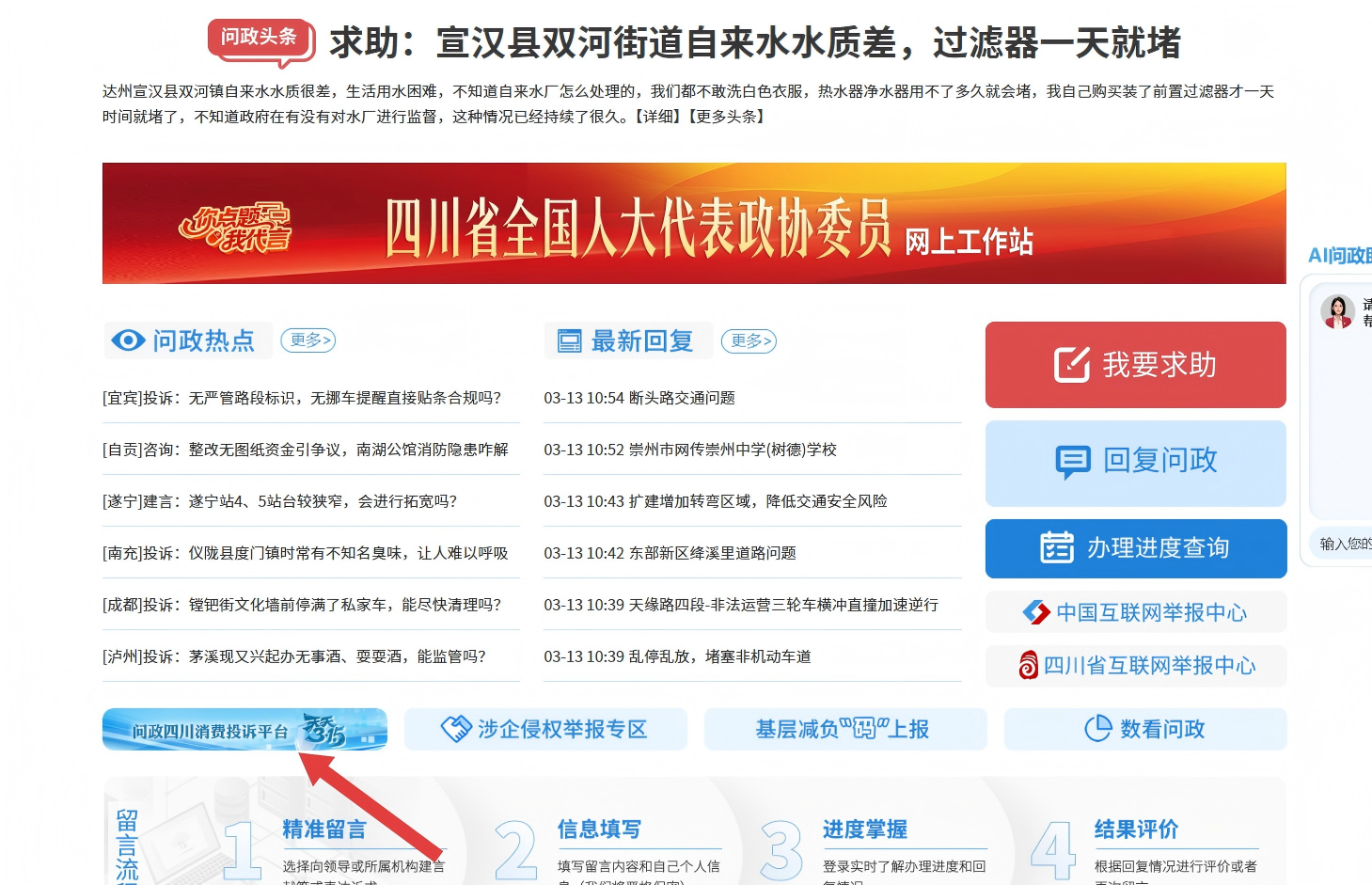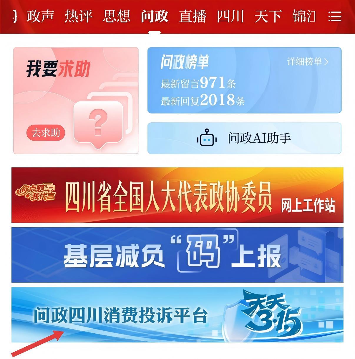 ①打开微信搜索“问政四川”小程序,点击“问政四川·天天315——消费投诉平台”即可参与留言。
