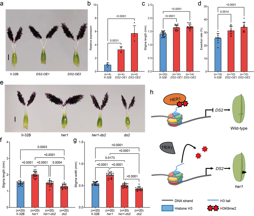 为此,团队通过EMS诱变,定向筛选获得柱头外露率显著提高的突变体her1,利用MutMap技术快速定位到候选基因HER1。HER1编码一个SET结构域蛋白,与拟南芥SUVR5同源,特异性识别并结合组蛋白H3K9me,调控H3K9me2水平。在her1突变体中,H3K9me2水平下降,导致下游基因DS2表达上调,进而促进柱头细胞增殖与伸长,最终使柱头外露率从36.32%提升至70.63%。