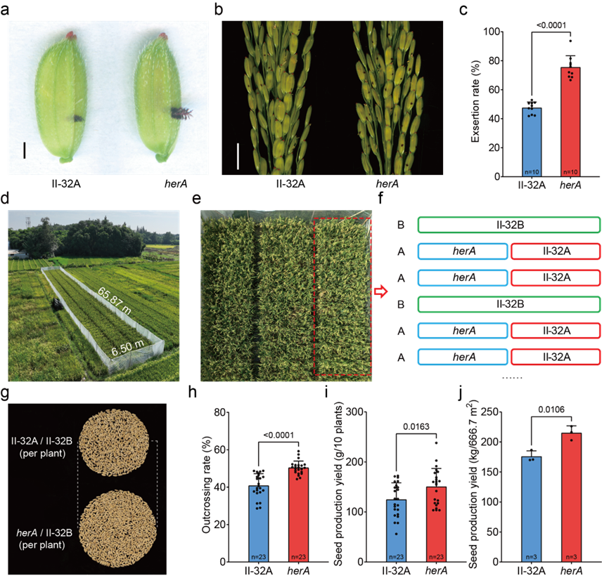 团队将her1突变基因导入三系不育系II-32A,创制出高柱头外露率不育系herA。田间试验表明,herA的异交率从40.80%提升至50.37%,每666.7 m²制种产量从175.76 kg增至215.08 kg,增幅达22.37%。同时,herA所配杂交组合在农艺性状上与对照无显著差异,表明HER1基因在杂交一代中无明显负效应,具有极高的育种应用价值。