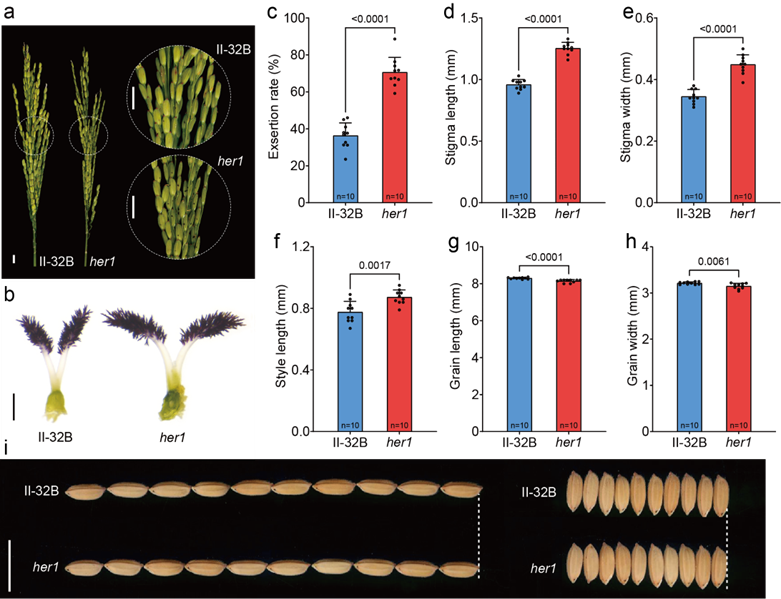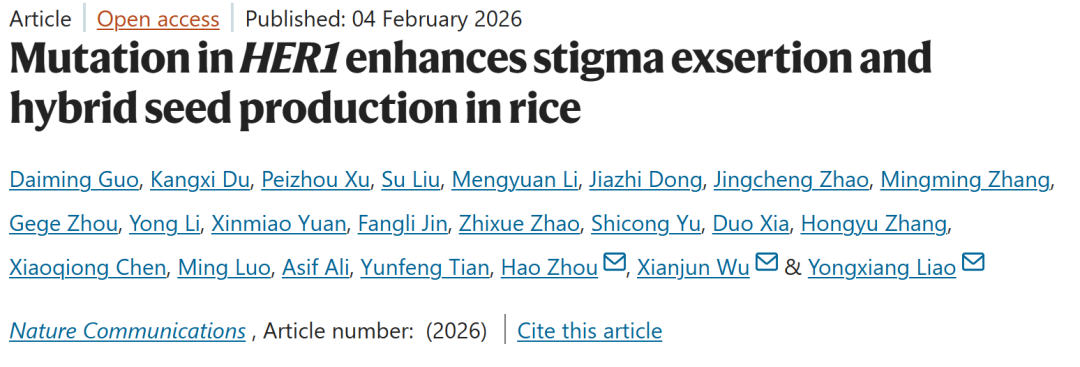 近日,四川农业大学廖泳祥/周浩/吴先军团队在《自然·通讯》(Nature Communications)发表题为“Mutation in HER1 enhances stigma exsertion and hybrid seed production in rice”的研究论文。该研究克隆了调控水稻柱头外露的关键基因HER1,系统阐明了其通过表观遗传途径调控柱头形态的分子机制,并成功创制高柱头外露率不育系,使杂交水稻制种产量提升20%以上,为杂交水稻高产制种提供了重要基因资源和育种新策略。