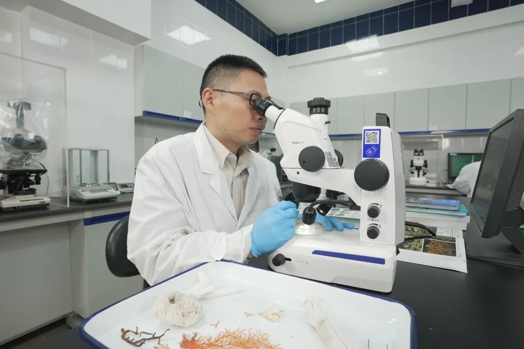 2024年,时小军正在显微镜下鉴定珊瑚礁生物样品。