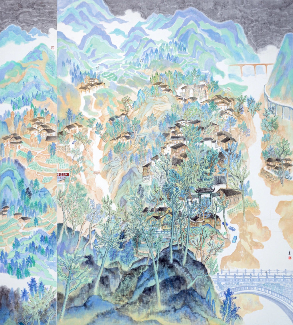 古今蜀乡山水间(中国画),尺寸:220cm×208cm。陶安萍 作