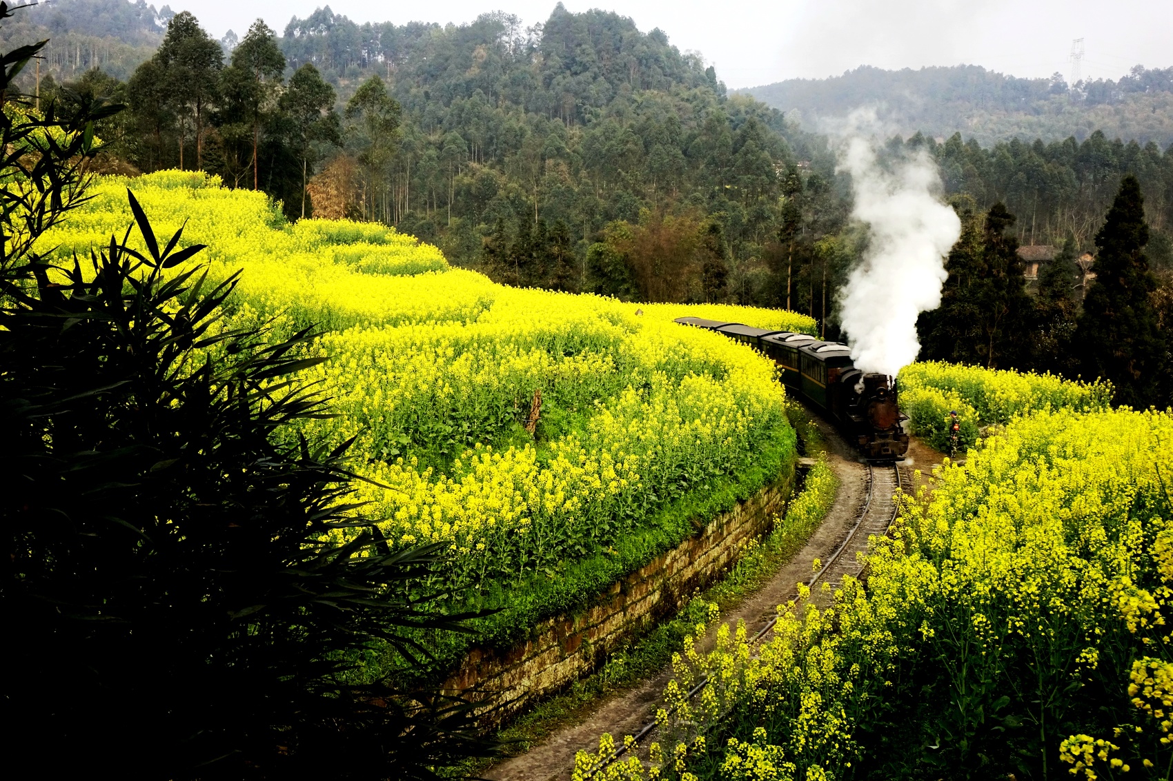 乐山市犍为县的嘉阳小火车,每年春天都要火上一回。老式蒸汽火车喘着粗气,从油菜花海里慢吞吞地穿过去,喷出的白雾飘在金色花田上,像从老电影里截下来的画面。游客可在段家湾观景台上打卡拍照,留下春天最美的印记。这种意境,来了便知道有多惬意。