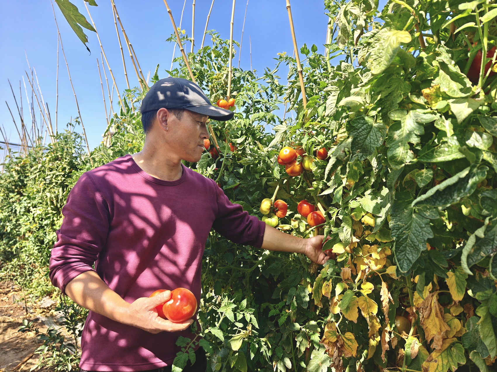 崇兴村坐拥金沙江干热河谷独特气候,光热充足、昼夜温差大,是发展特色果蔬的天然沃土。邹蔼福是这里的果蔬种植“土专家”,从事果蔬种植已有30余年。从普通农户到远近闻名的种植能手,他常年扎根田间地头,摸索种植技术。为了种出高产、优质的西红柿,邹蔼福采用双干整枝、每干留五苔至六苔果的科学方式,前期坐果后施用平衡肥,后期膨果期追施高钾肥和中微量元素肥,并配合氨基酸、鱼蛋白提升果实品质,通过一套适配本地的栽培技术,实现了产量与品质双提升。