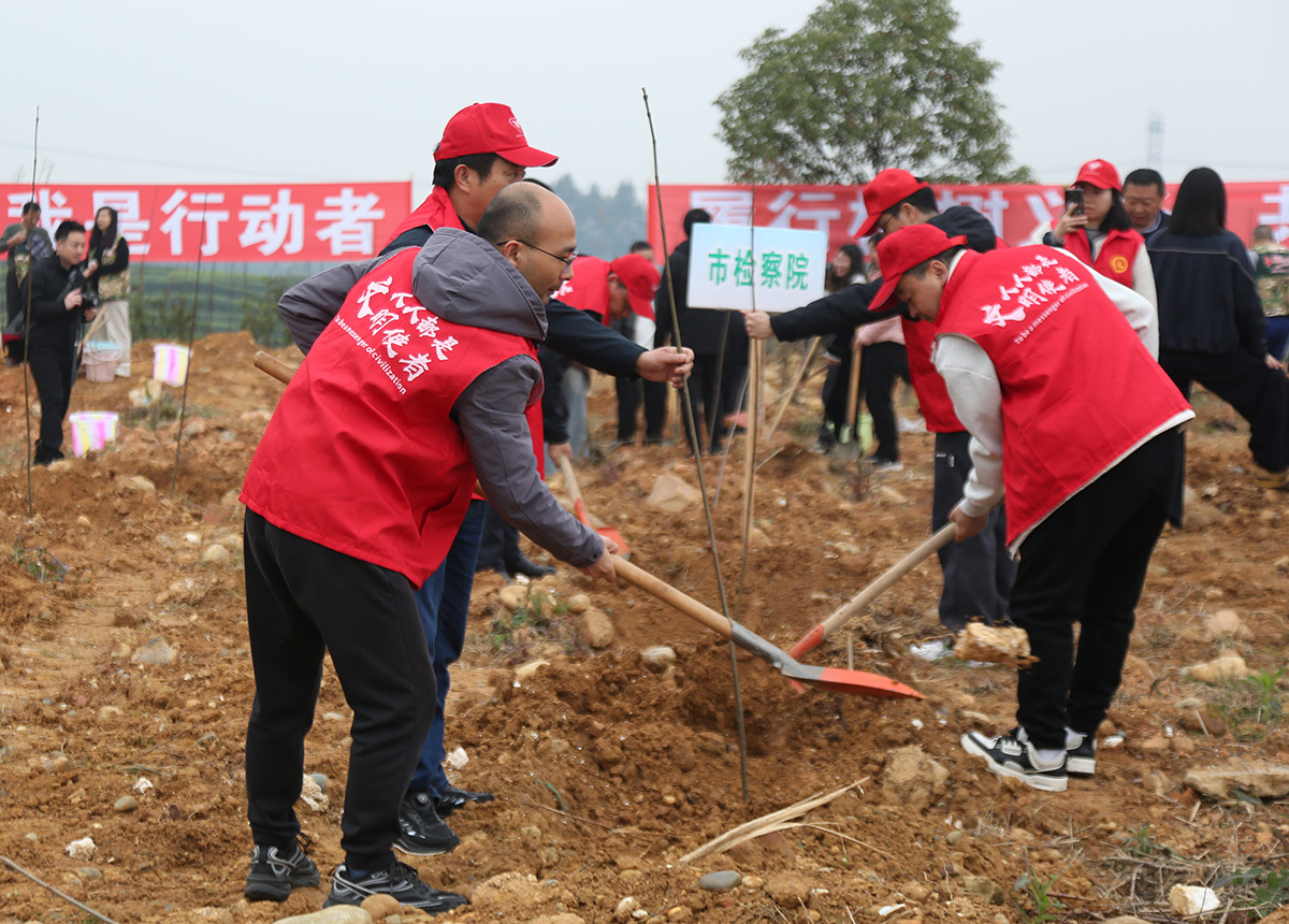 五通桥区西坝镇庙沱村,来自全区的机关干部、企业代表们三五人一组有序配合,让326株红叶李、红梅、紫薇、红枫新苗错落有致地扎根山坡。“种一棵活一棵,植一片绿一方。”现场一位林业技术人员一边指导栽种一边介绍。当地坚持管育并重,全程技术指导,把义务植树与城乡生态更新有机融合,让群众“推窗见绿、出门入园”。