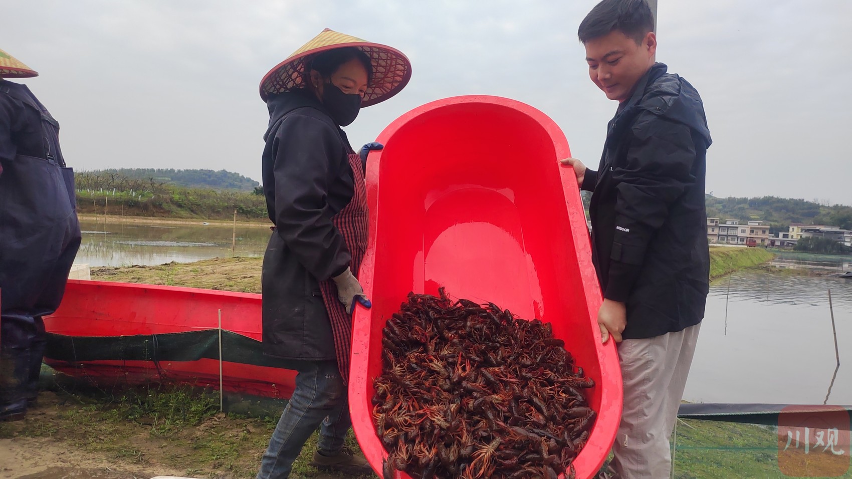 周先华(右)收获小龙虾。