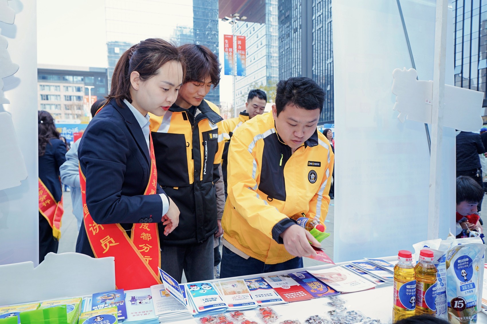 在启动仪式上,浦发银行成都分行与其他金融机构代表一起,向外卖员代表赠送“金融知识大礼包”,聚焦“两司两员”(货车司机、网约车司机、外卖员、快递员)等群体的金融需求,传递金融温度,彰显金融服务的普惠性与包容性。