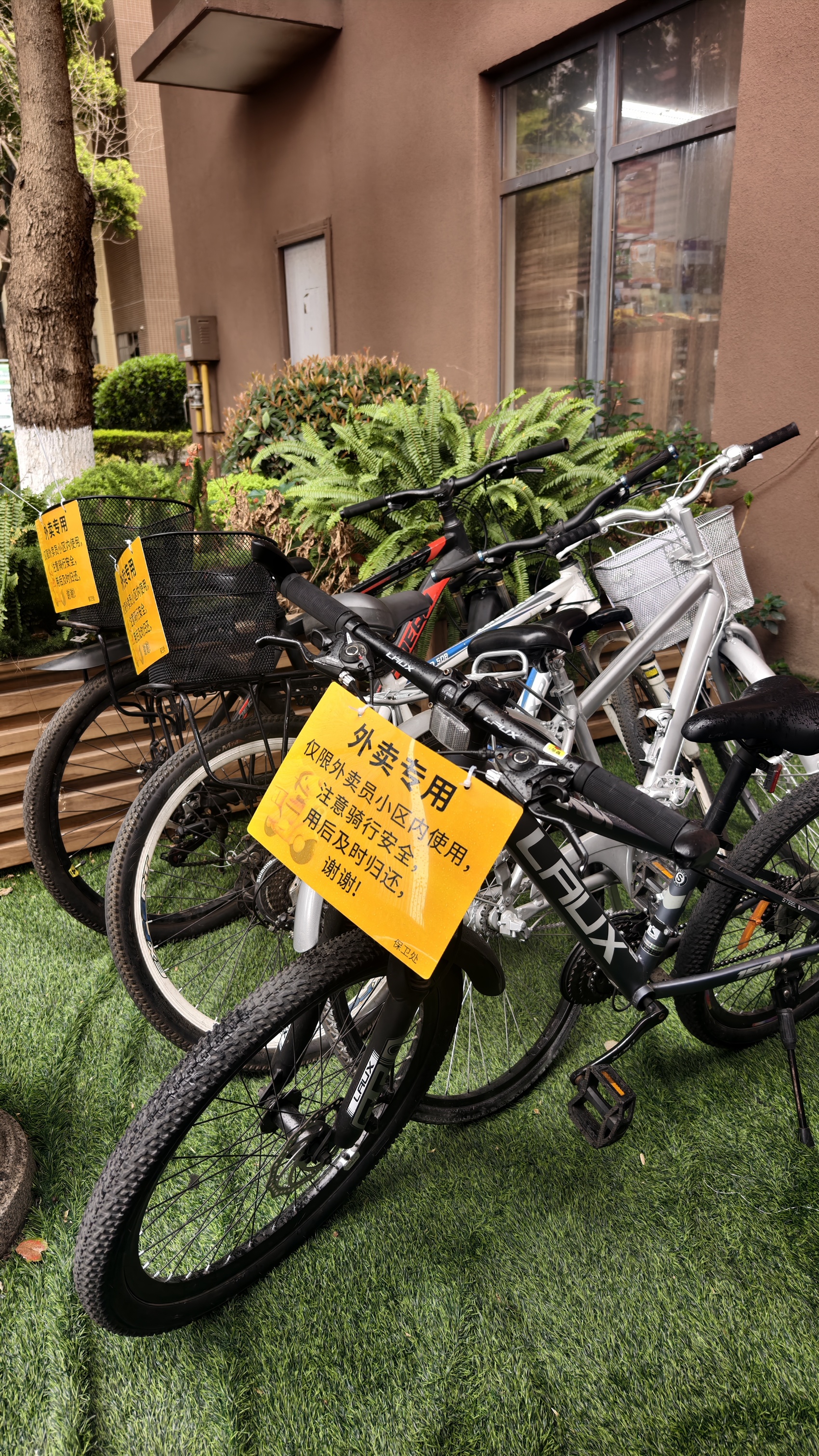 保安大哥欣然应允,随后便将自行车摆放在保安室旁。