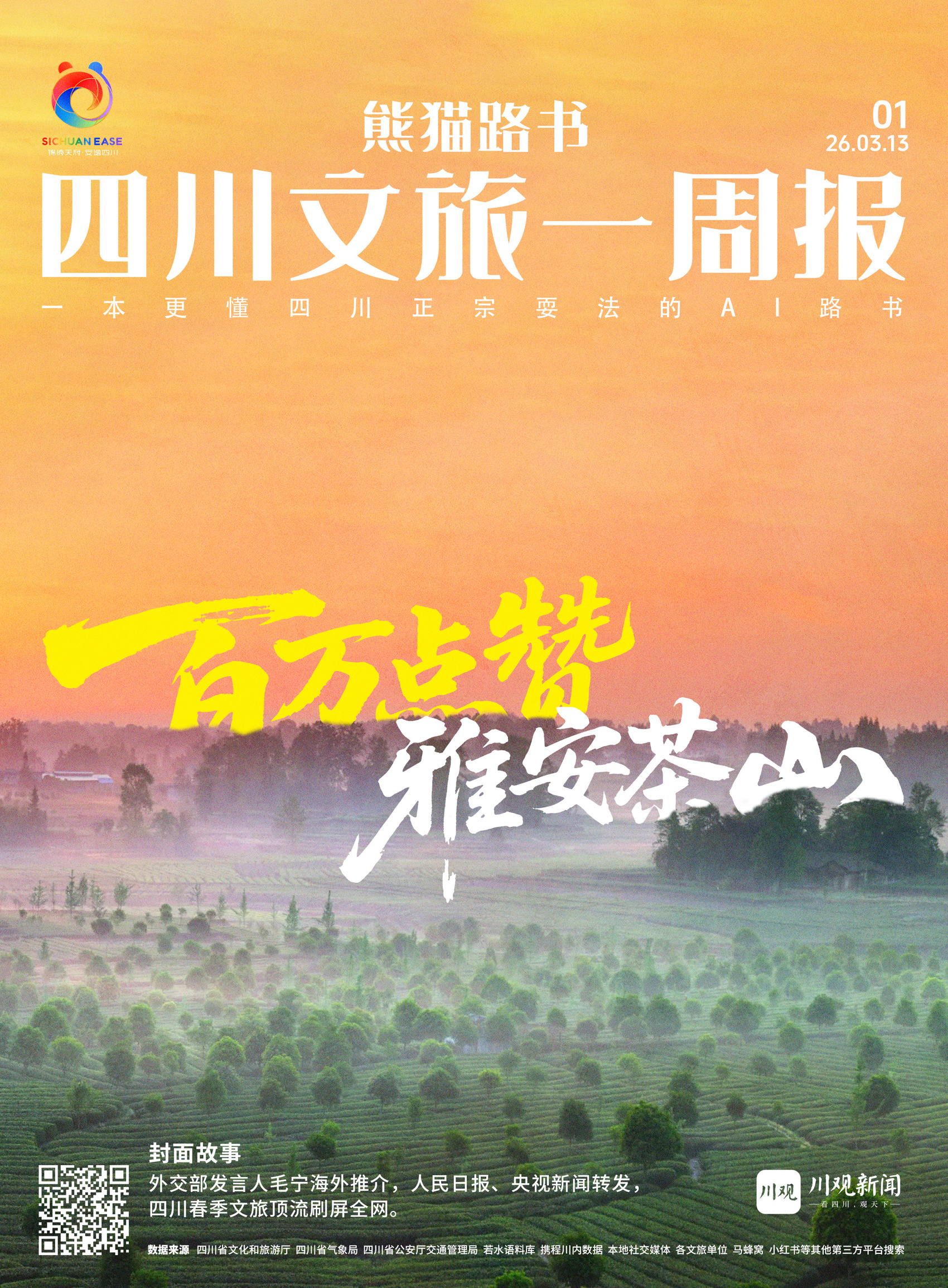 携程、马蜂窝春日茶山搜索周环比+178%,小红书相关笔记破2.3万,外交部发言人毛宁海外推介,人民日报、央视新闻转发,四川春季文旅顶流刷屏全网。