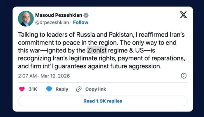 佩泽希齐扬表示,结束当前由美国和以色列挑起的战争的“唯一途径”,是承认伊朗的合法权利、支付战争赔偿,并由国际社会提供防止未来侵略行为的坚定保障。