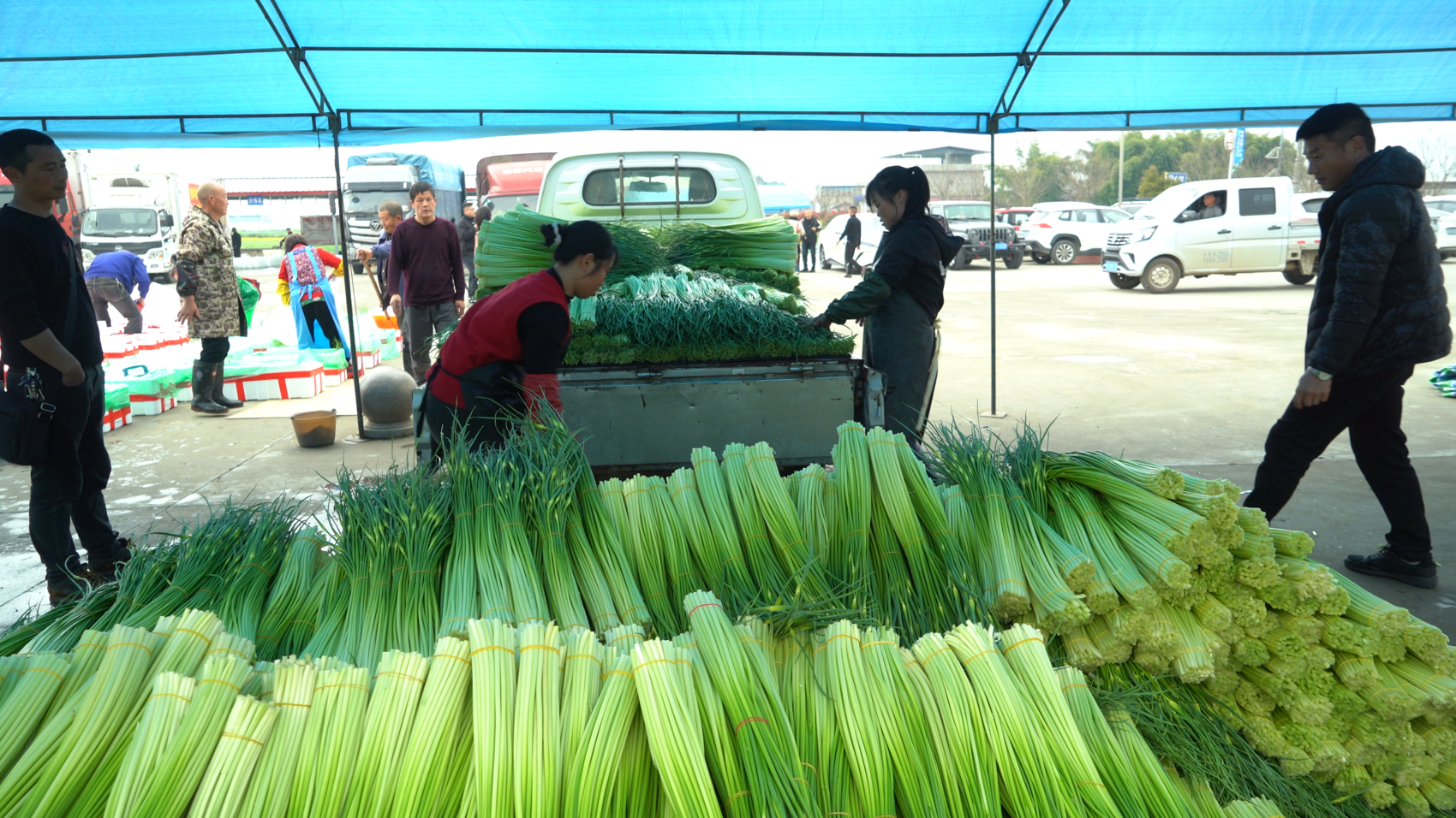 会定价还不够,还得让市场认这个价。在细节上种植户也花了心思,小橡皮筋,一斤左右一小捆,长短粗细挑得匀净,一把刚好够一炒一盘菜。
