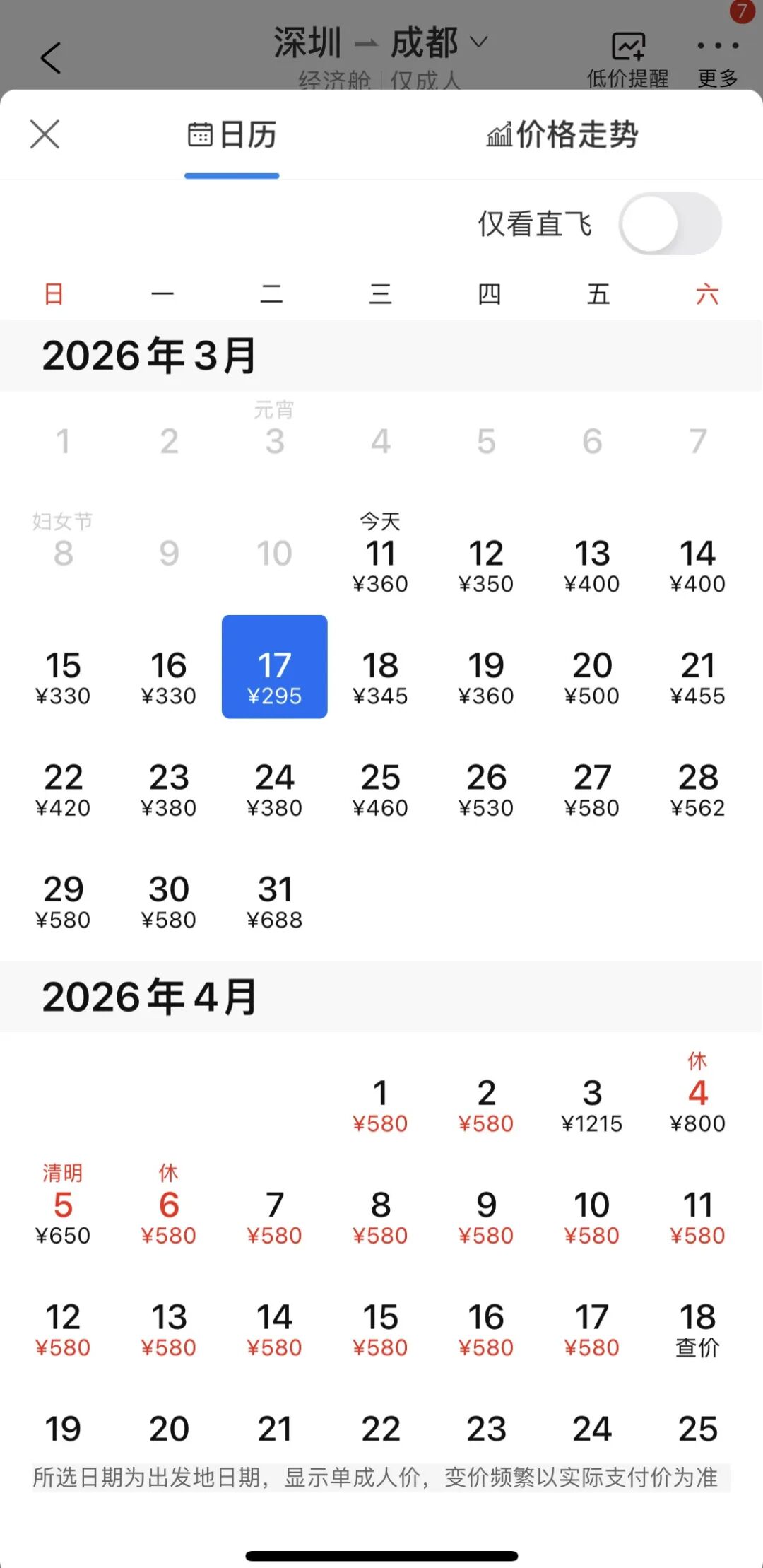 单程价格跌至350元