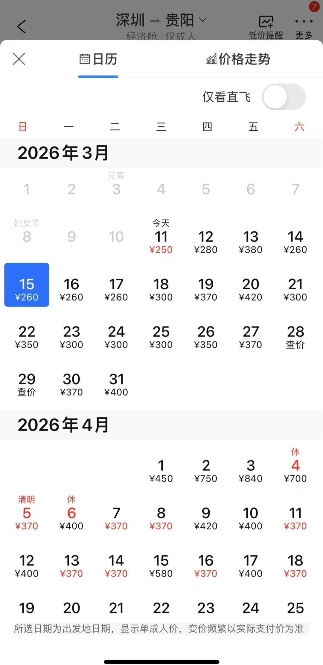 单程机票价格低至250元