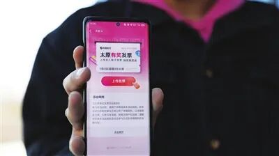 3月11日,市民正操作手机,进入“太原有奖发票”活动页面,准备上传发票。