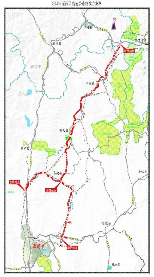 金西高速公路全长约211.6公里,采用双向四车道高速公路建设标准,设计速度80公里。金西高速是《四川省高速公路网布局规划(2022—2035 年)》中20条成都放射线之一,预计2031年建成通车,建成后将结束凉山州甘洛、越西、喜德三县不通高速的历史,打通成都-西昌-云南新通道,提升四川南向出川能力。