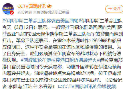 据CCTV国际时讯报道,伊朗伊斯兰革命卫队3月12日表示,一艘悬挂马绍尔群岛国旗的美国“萨菲西亚”号油轮因无视伊朗伊斯兰革命卫队海军的警告而遭到打击。革命卫队还表示,在霍尔木兹海峡作业的油轮和船只应该明白,这种不安全是美国在该地区残酷侵略的结果。为了自身安全,他们必须遵守伊朗宣布的战时状态下的航行法律法规。