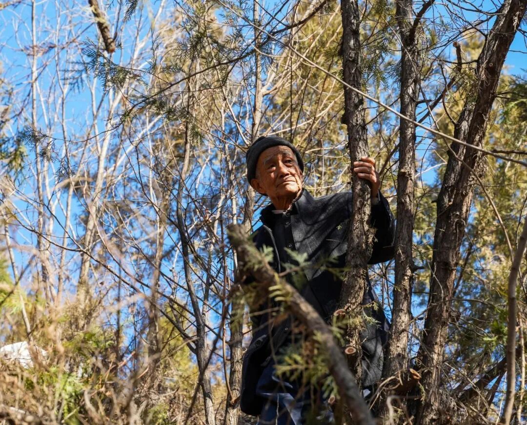 阳光下,他布满老茧的手轻轻抚过树干