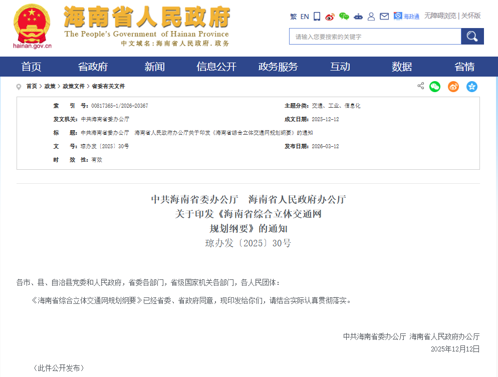 海南省委办公厅、海南省人民政府办公厅日前联合发出通知,《海南省综合立体交通网规划纲要》(以下简称《纲要》)已经省委、省政府同意,正式对外公布。《纲要》提出,到2035年,海南基本建成便捷高效、品质人文、绿色集约、智能先进、安全可靠的现代化高质量综合立体交通网。