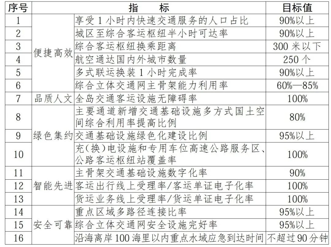 《纲要》明确,到2035年,海南将实现省内省外互联互通、市(县)级节点立体连通,综合交通运输服务能力和品质不断提高,旅客联程运输便捷顺畅,货物多式联运经济高效,基本实现“海南1234出行交通圈”(海口经济圈、三亚经济圈、儋洋经济圈1小时以内通勤,海口、三亚等主要城市2小时通达全域,3小时畅行全岛,4小时基本通达全国主要城市及东南亚城市)。全面融入我国“全球123快货物流圈”(国内1天送达、周边国家2天送达、全球主要城市3天送达)。