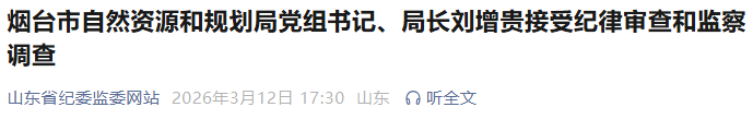 据烟台市纪委监委消息:烟台市自然资源和规划局党组书记、局长刘增贵涉嫌严重违纪违法,目前正接受烟台市纪委监委纪律审查和监察调查。