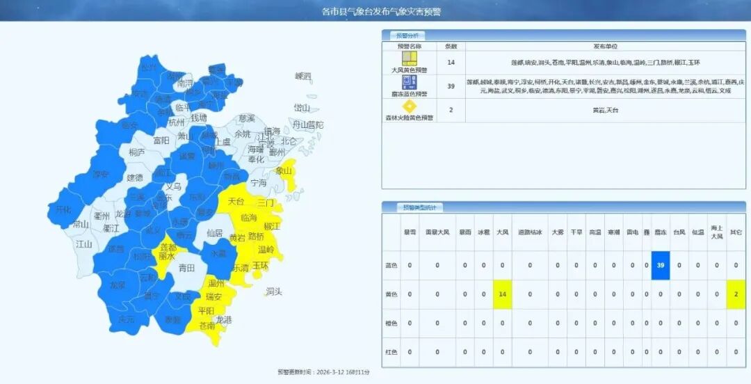截至16点,浙江发布39条霜冻蓝色预警信号,大家明早出门一定记得添衣,注意保暖。