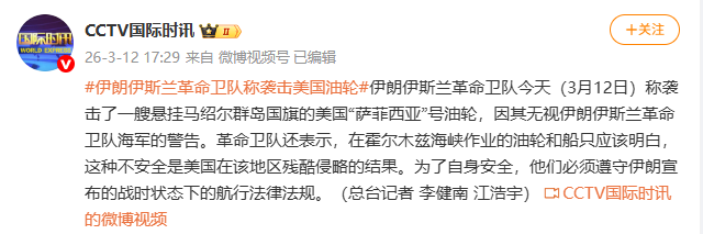 伊朗伊斯兰革命卫队今天(3月12日)称袭击了一艘悬挂马绍尔群岛国旗的美国“萨菲西亚”号油轮,因其无视伊朗伊斯兰革命卫队海军的警告。革命卫队还表示,在霍尔木兹海峡作业的油轮和船只应该明白,这种不安全是美国在该地区残酷侵略的结果。为了自身安全,他们必须遵守伊朗宣布的战时状态下的航行法律法规。