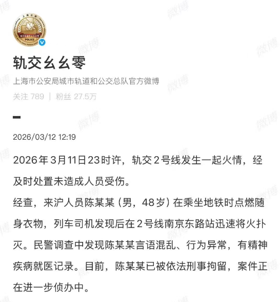 3月12日,上海市公安局城市轨道和公交总队官方微博发布最新通报: