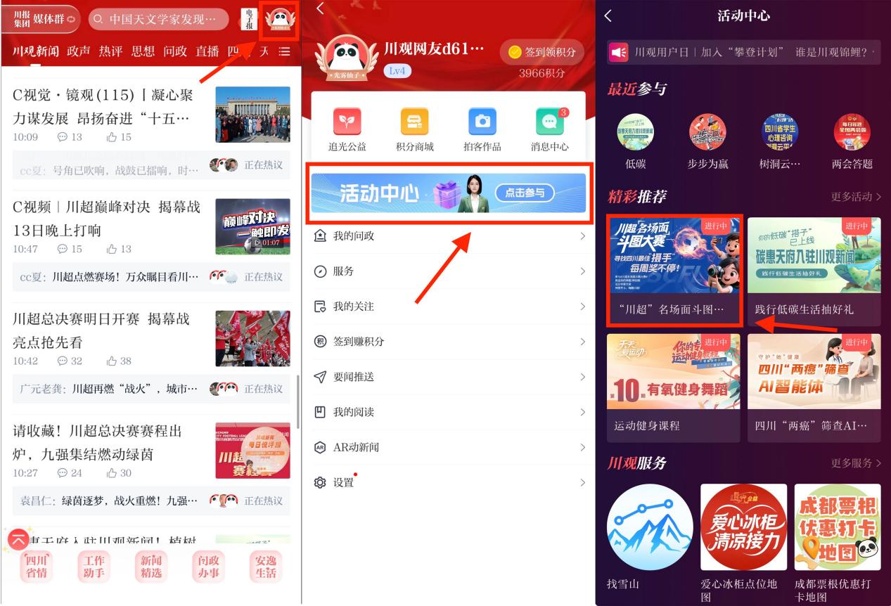 入口二:打开川观新闻App,点击首页右上角头像选择“活动中心”,进入选择“斗图大赛”按钮,点击进入活动。