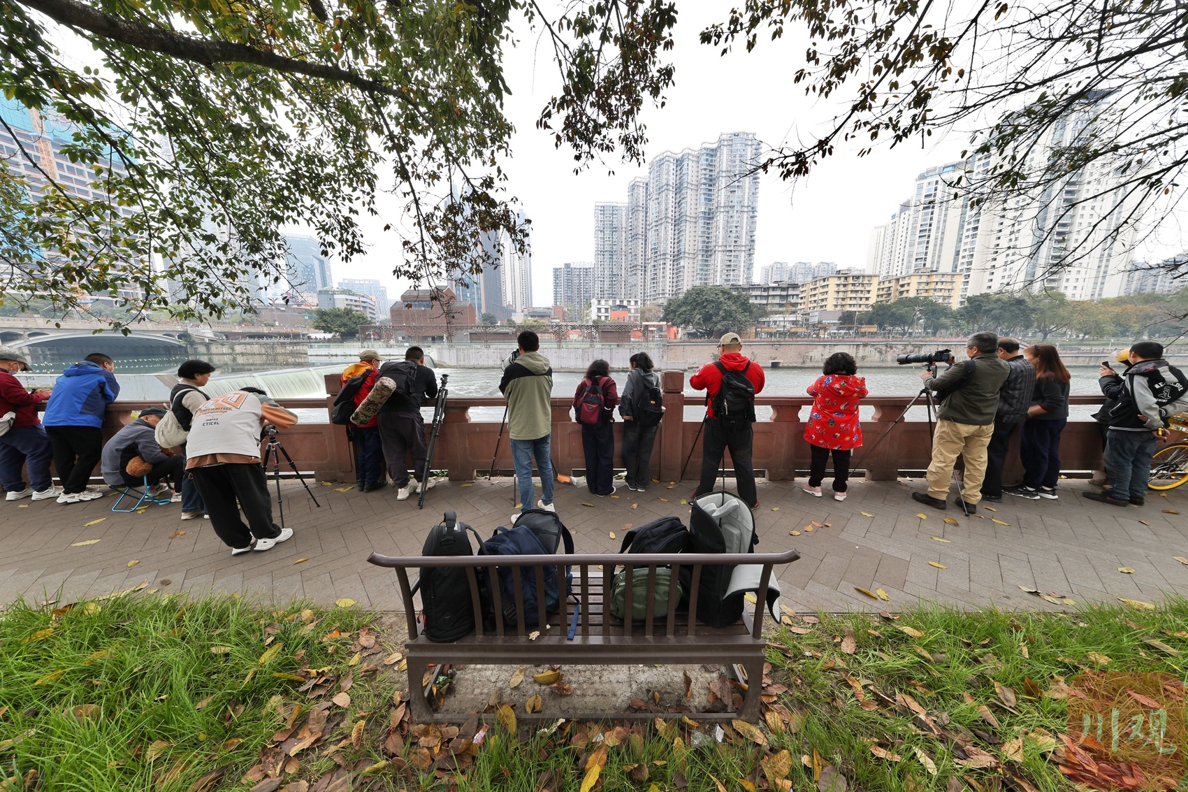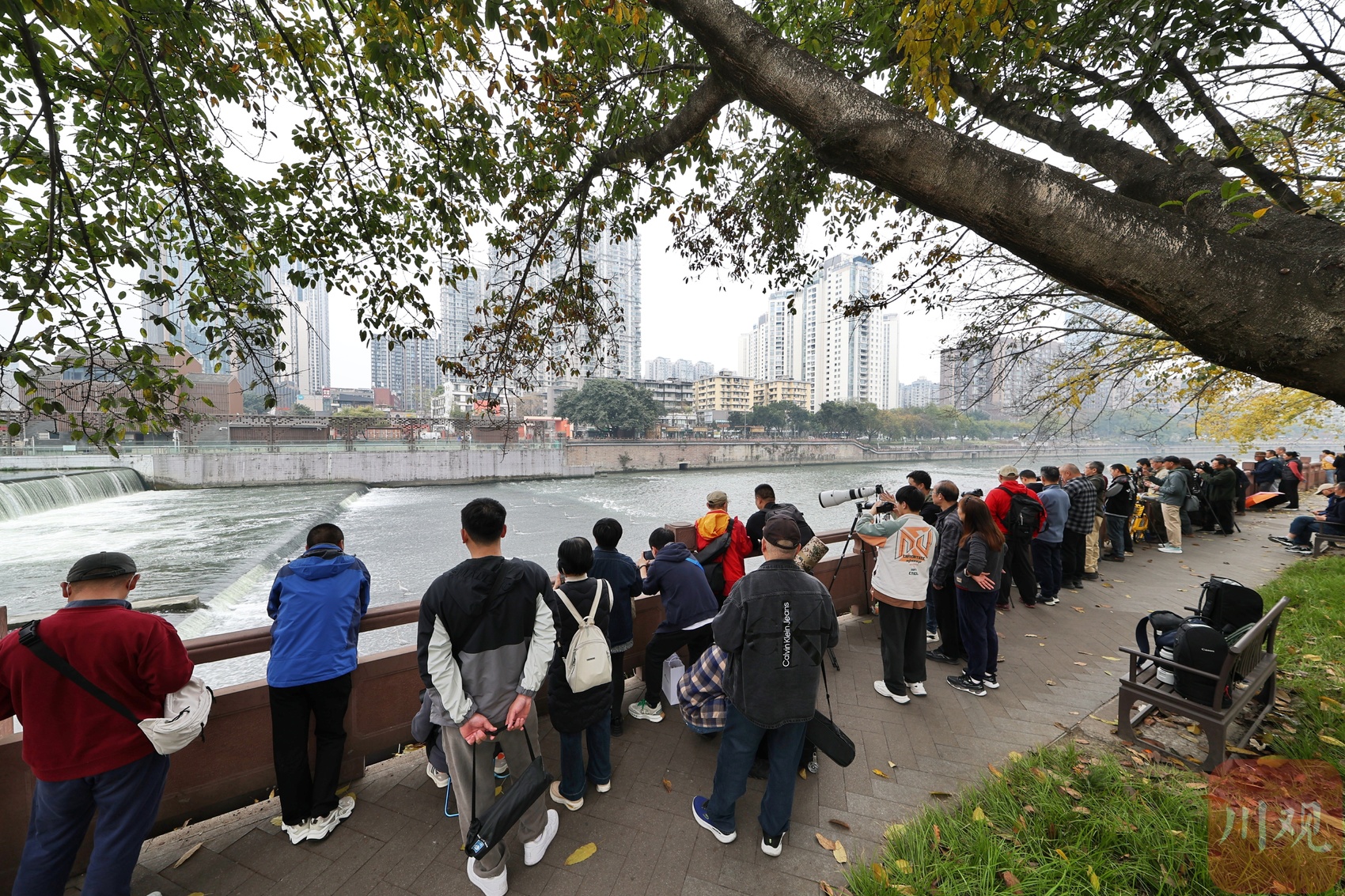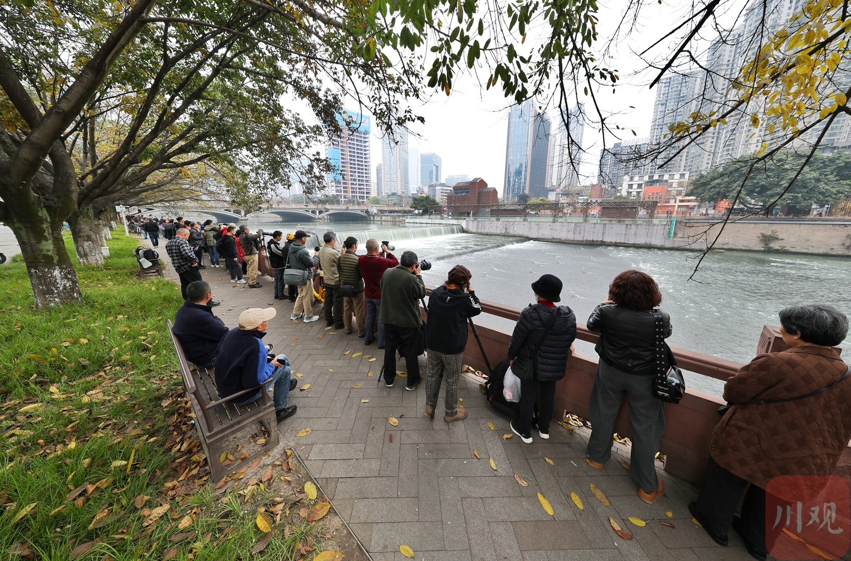 观灰鹭“摸鱼”,锦江岸边站了许多市民及摄影爱好者