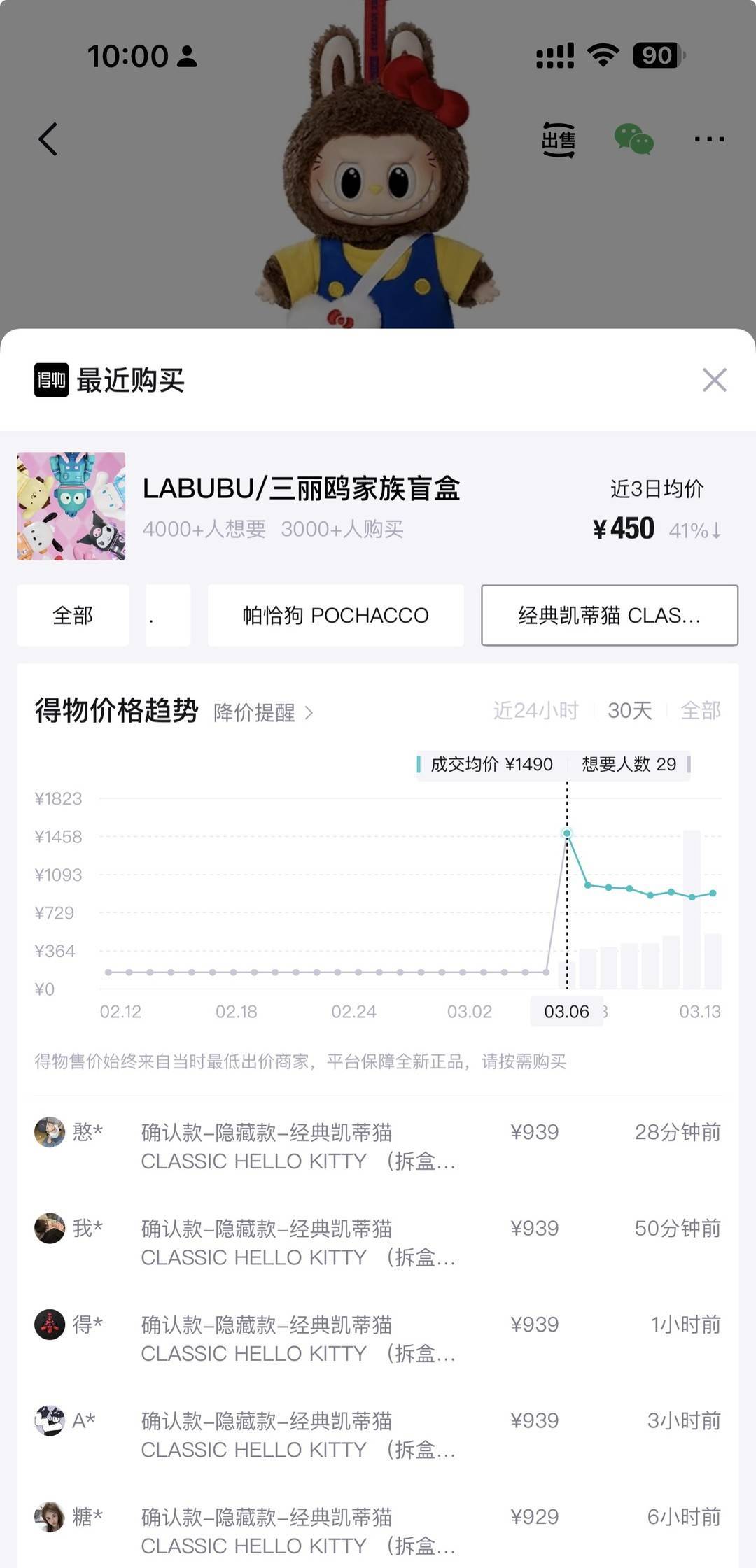 潮流交易app上,隐藏款“经典凯蒂猫”最高价格达到1490元