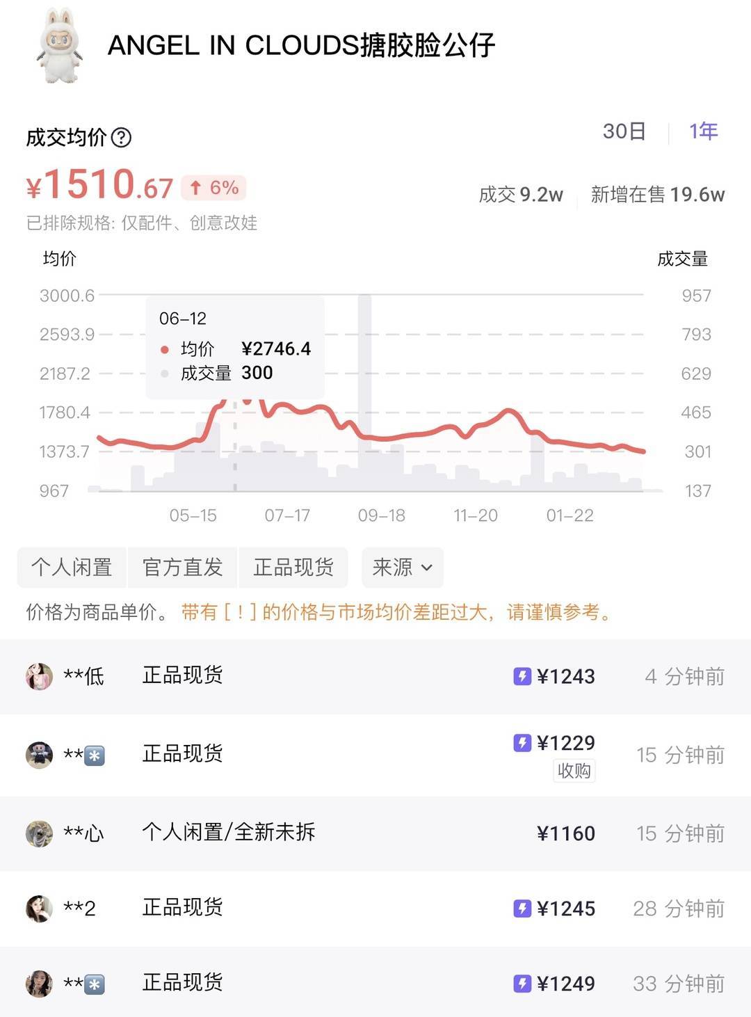 值得一提的是,近期泡泡玛特对THE MONSTERS系列搪胶毛绒大中小娃进行了全品类补货,此前爆火的大天使、大首领、大夏日等大中娃,在潮流交易平台均已低于原价,心动马卡龙、坐坐派对、前方高能等搪胶毛绒挂件盲盒,普通款也全部低于原价。