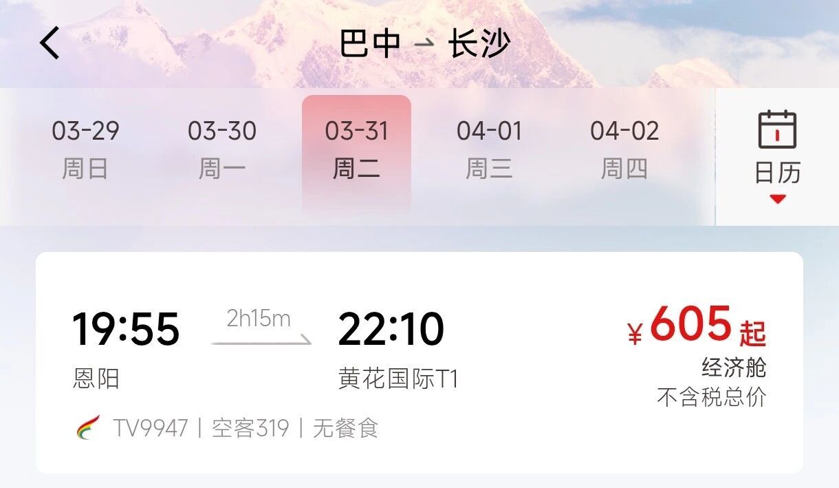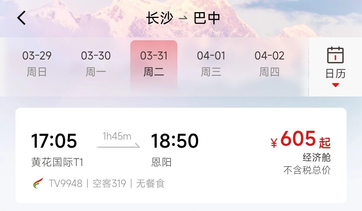 西藏航空航班号TV9948长沙黄花国际机场17:05起飞,18:50抵达巴中恩阳机场,全程飞行1小时45分。