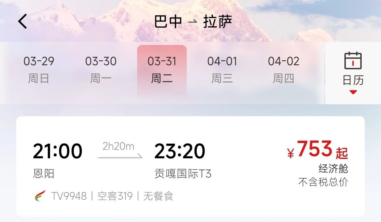 西藏航空航班号TV9948巴中恩阳机场21:00起飞,23:20抵达拉萨贡嘎国际机场,全程飞行2小时20分;