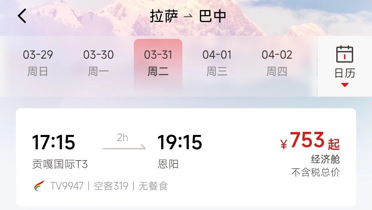 西藏航空航班号TV9947拉萨贡嘎国际机场17:15起飞,19:15抵达巴中恩阳机场,全程飞行2小时。