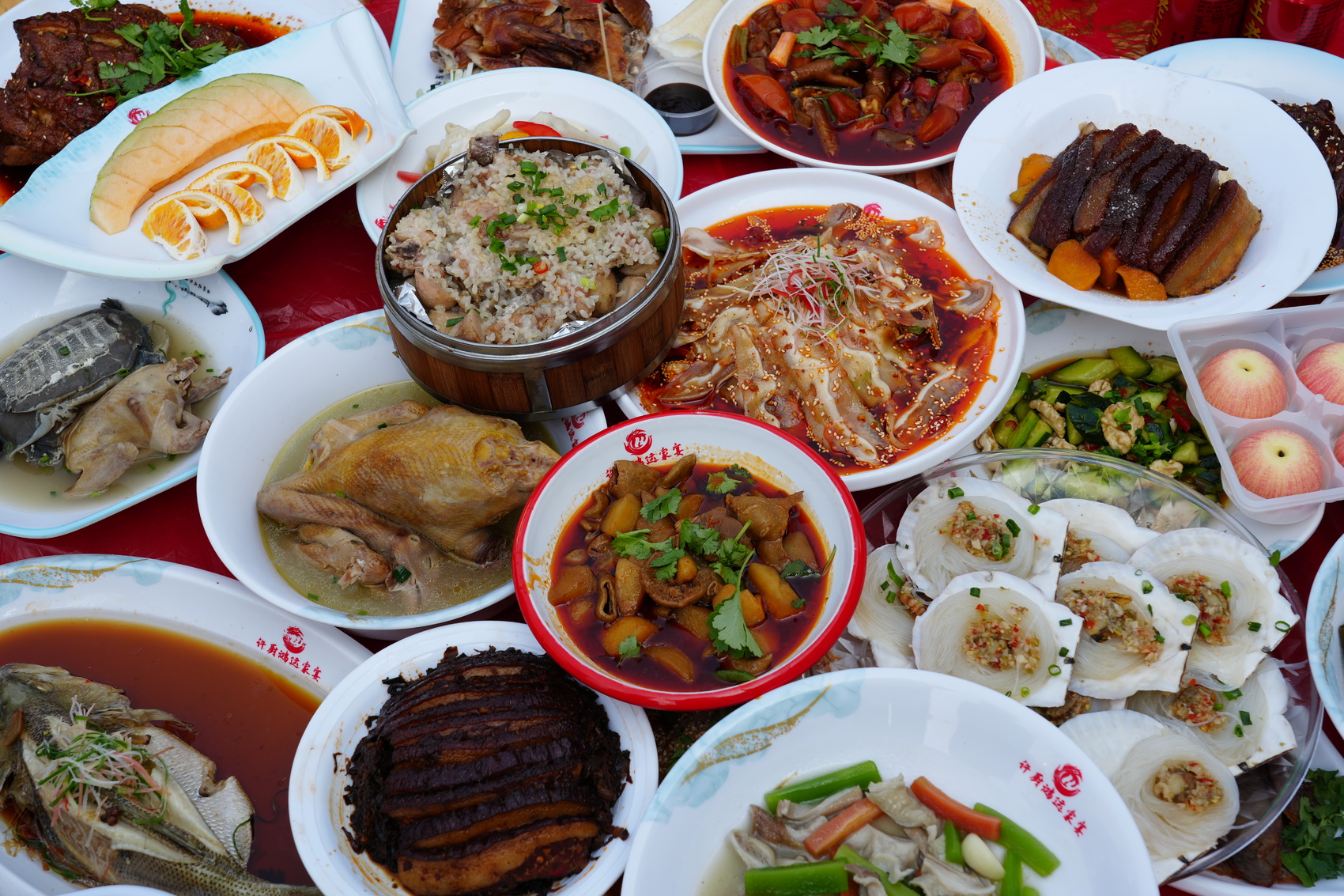 在四川乡间,坝坝宴的菜品极为丰盛。图为绵阳梓潼县的坝坝宴菜品。