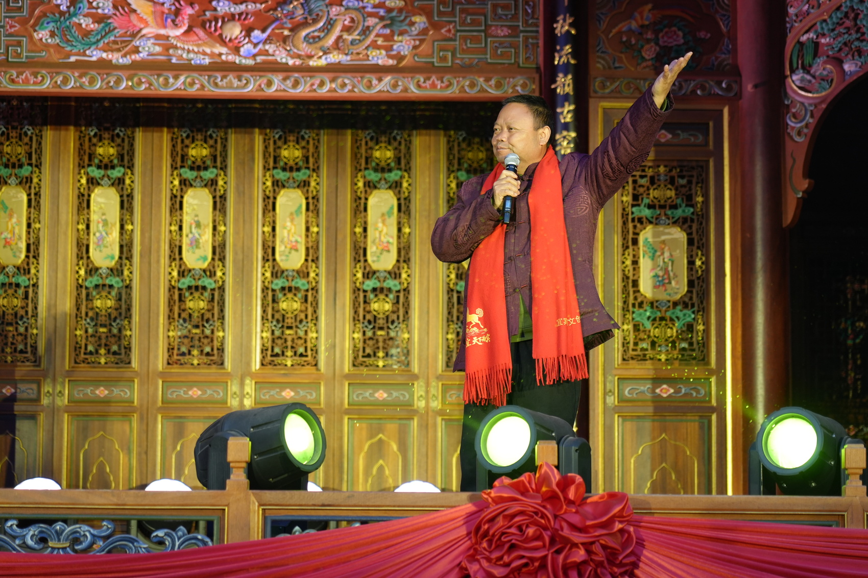 支客师是传统宴席上负责统筹接待、主持仪式、调动气氛并处理各项事务的核心人物。图为高县庆岭镇支客师杨其才正在“请春酒”上调动气氛。