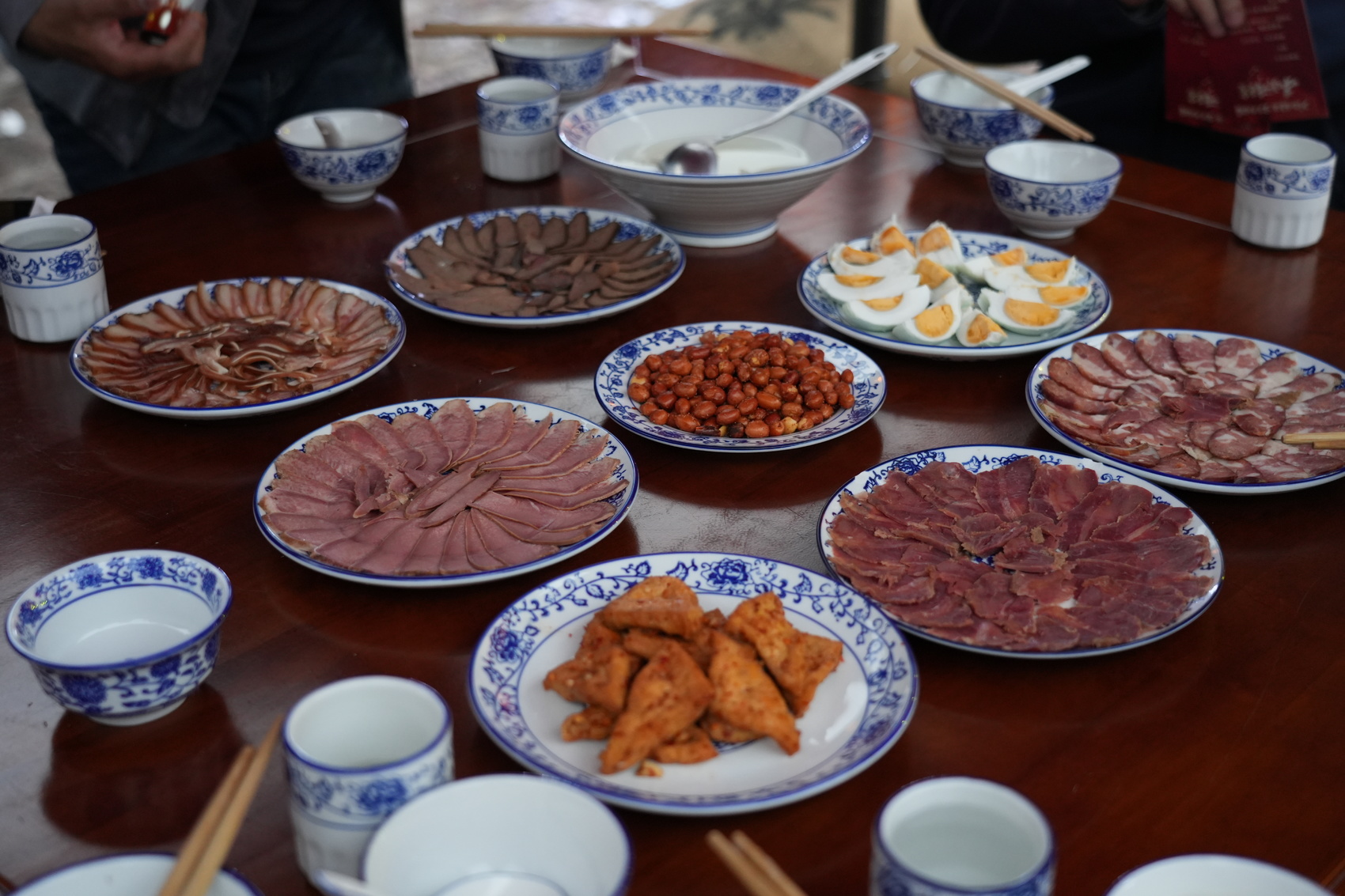 “请春酒”最大的特色是“春酒三台”。图为第二台,以腊肉、卤味等组成的干盘子。
