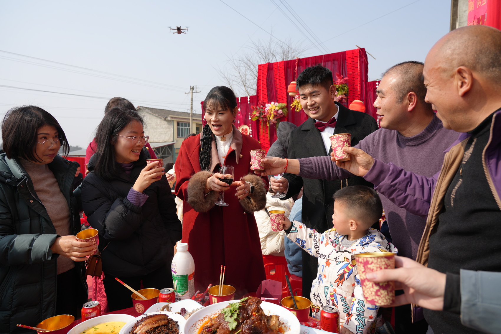 “请春酒”是川南一带常见的坝坝宴形式。图为宜宾市民体验“请春酒”、贺团圆。
