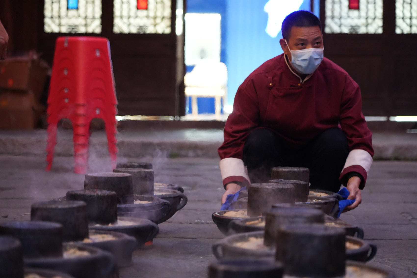 “请春酒”成为地方发展农文旅的重要媒介。图为在宜宾市区举办的高县“请春酒”现场,工作人员等候传菜通知。